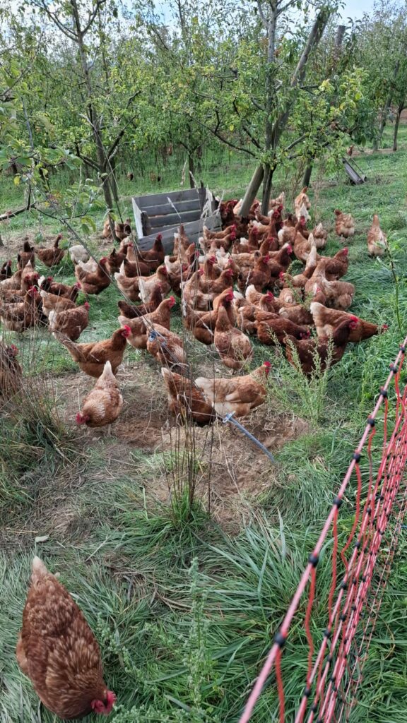 Des poulaillers mobiles et beaucoup d’espace entre les pommiers pour se balader, gratter et picorer afin de donner de bons œufs aux Amapiens!